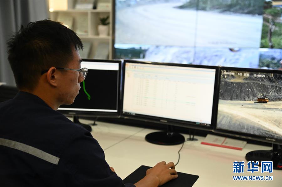 在焦煤集团千业水泥公司的智能调度中心,技术人员通过计算机遥控操作无人驾驶电动运输车(8月25日摄)。新华社记者 张浩然 摄