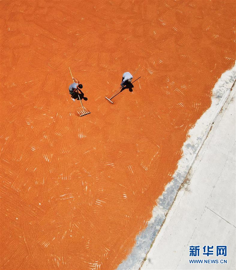 8月26日,贵州省遵义市汇川区团泽镇团泽居村民在晾晒高粱(无人机拍摄)。 眼下,贵州省遵义市种植的100多万亩酿酒高粱喜获丰收,村民们抢抓晴好天气忙着采收、晾晒高粱。近年来,遵义市依托成熟的酱香白酒产业,大力推进高粱种植规模化、标准化、专业化、品牌化发展,常年种植高粱100万亩以上,涉及全市14个县(市、区)184个乡镇29万余户农民。酿酒高粱映红农民增收致富奔小康之路。 新华社发(罗星汉 摄)