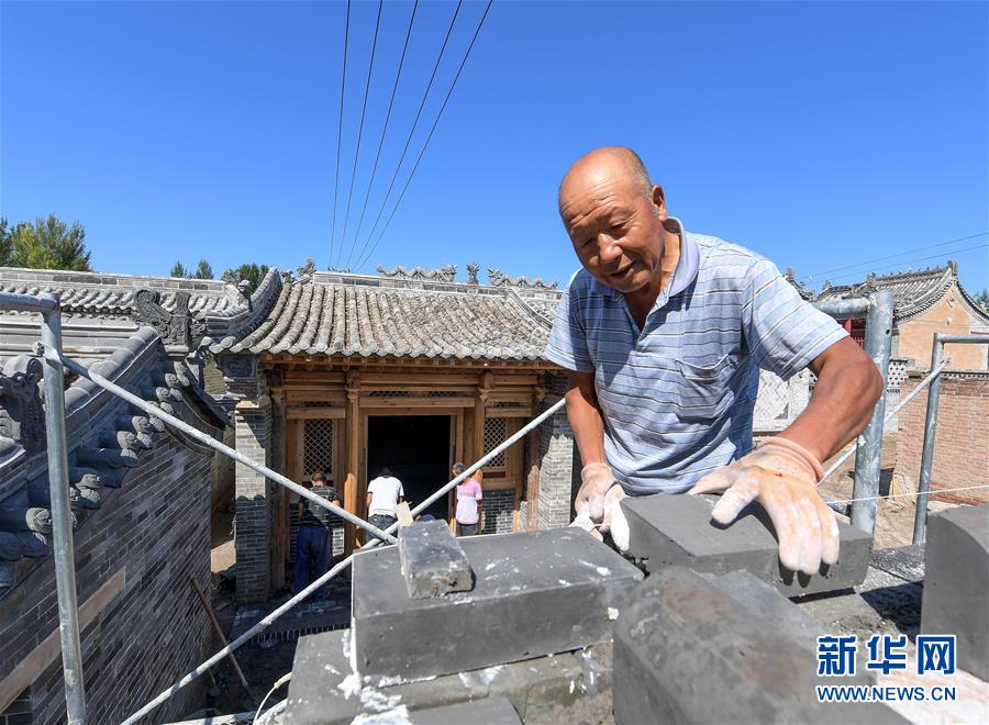 8月25日,张家口市蔚县涌泉庄乡涌泉村村民赵进忠参加村内仿古建筑的整修。新华社记者 李贺 摄