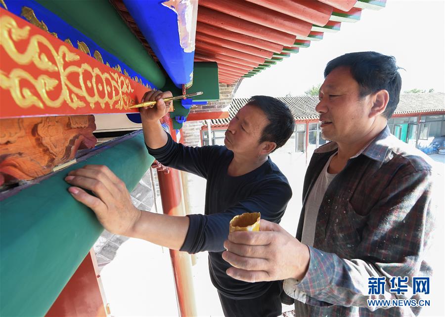 8月25日,张家口市蔚县涌泉庄乡涌泉村村民赵永河(右)协助画工装饰村里的博物馆大门横梁。 新华社记者 李贺 摄