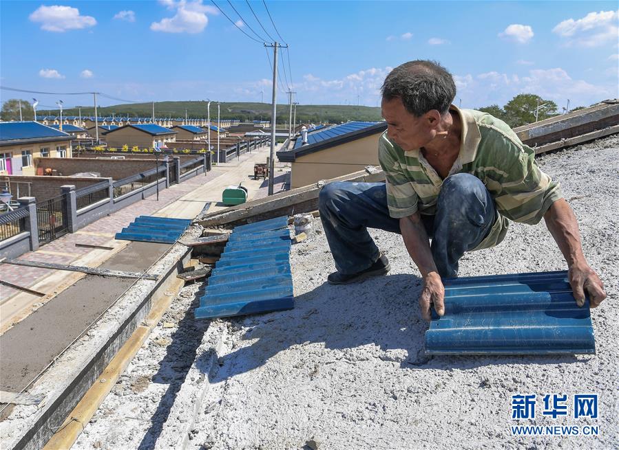 8月27日,张家口市张北县台路沟乡后大营滩村村民李忠在村民的回迁房建设工地上忙碌。 新华社记者 李贺 摄