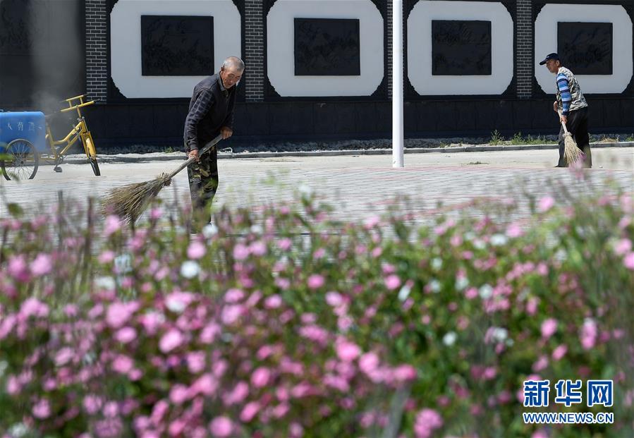 8月27日,两位村民在清扫张家口市张北县台路沟乡后大营滩村的公共场地。 新华社记者 李贺 摄