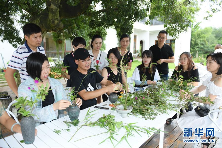 8月27日,埭溪镇成人文化技术学校组织插花老师给民宿经营者进行插花培训。 浙江湖州吴兴区埭溪镇芳山村是一个山区村落。近年来,芳山村依托良好的生态资源优势发展民宿旅游,乡村风貌焕然一新,村民通过经营民宿在家门口实现就业增收。 新华社记者 翁忻旸 摄