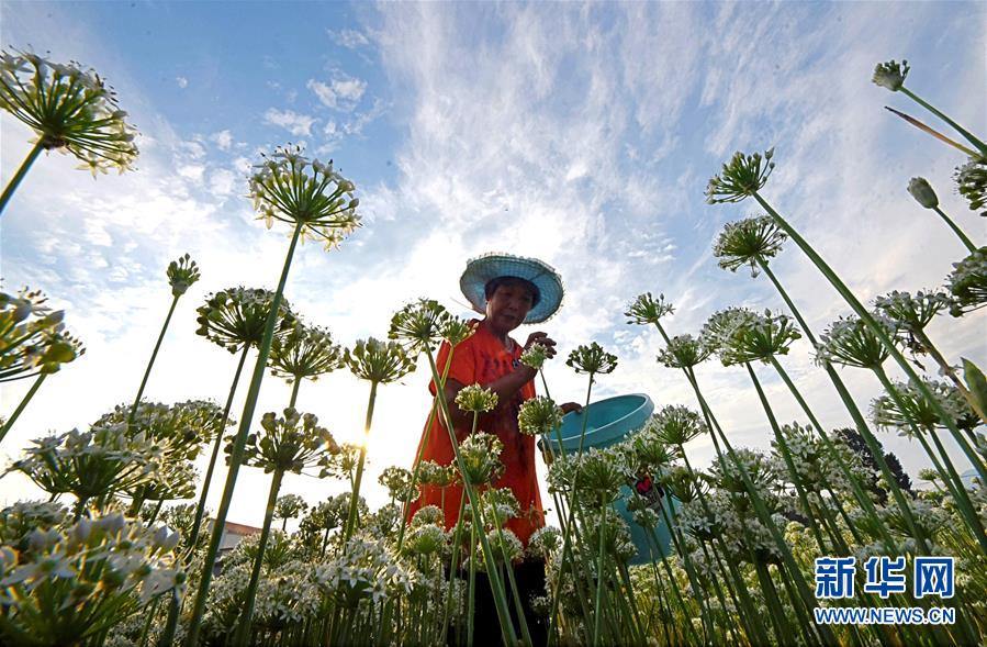 8月29日,山东省淄博市沂源县悦庄镇黄山子村的农民在田间采摘韭菜花。 初秋时节,山东省淄博市沂源县农民种植的万亩韭菜迎来盛花期,当地农民加紧采摘韭菜花销往各地。近年来,无公害韭菜种植成为当地农民增收致富的特色产业之一。 新华社发(赵东山 摄)