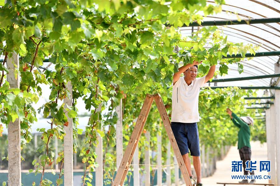 8月29日,陈明忠(左)在果园里打理葡萄枝叶。新华社记者 刘军喜 摄