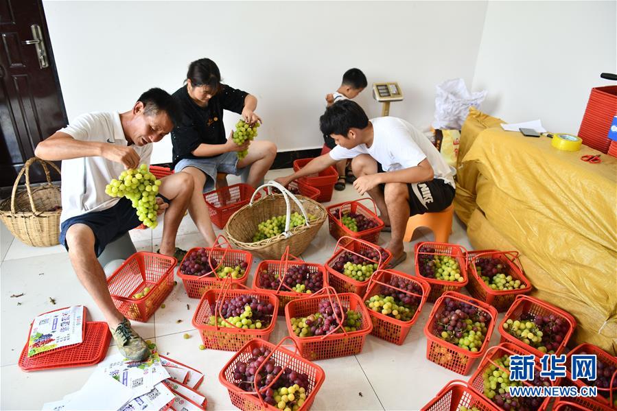 8月29日,陈明忠(左一)和家人一起包装葡萄。新华社记者 刘军喜 摄