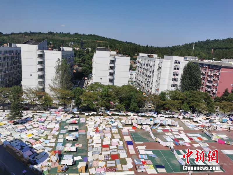 图为密密麻麻的被絮成为校园一道景观。 胡传林 摄