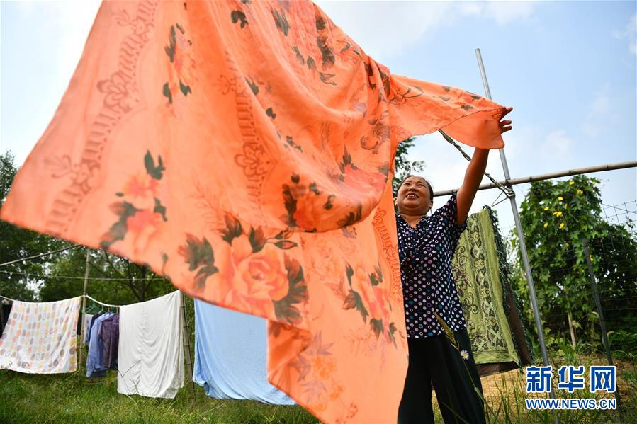 8月30日,傅兴芳在老年服务中心里晾晒床单。新华社记者 刘军喜 摄