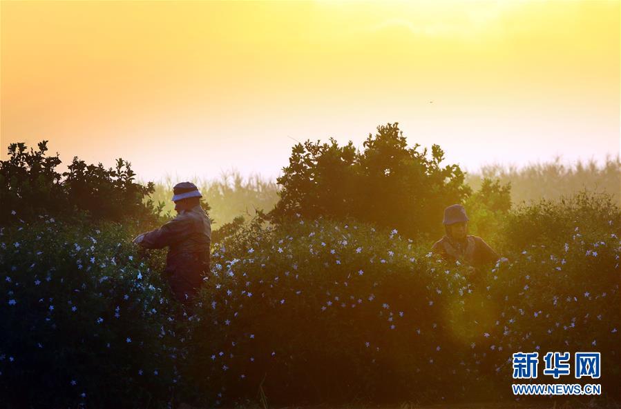 8月29日,人们在埃及西部省采摘茉莉花。 每年6月到11月是埃及茉莉花的收获季。收获的茉莉花将运送到工厂,用来制作香氛和精油。 新华社发(艾哈迈德·戈马 摄)