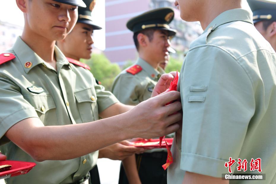 8月31日,武警江西总队某部直属队为即将走出军营的12名满服役期的老兵举行军营告别仪式,留队士兵为退伍老兵佩戴光荣花。 许书灿 摄
