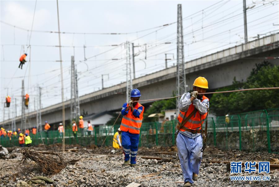 8月31日,中铁四局电气化公司施工人员在双墩集站站改施工现场作业。 近日,由中铁四局电气化公司负责施工的合安外绕线双墩集站站改施工紧张进行,施工人员不畏高温,坚守岗位,确保重点工程建设进度。 新华社记者刘军喜摄