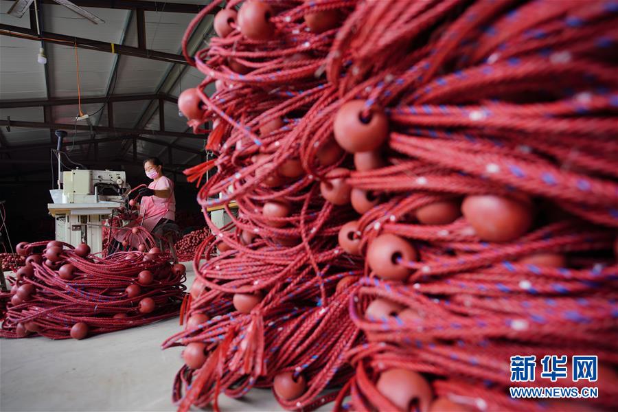 8月31日,河北省滦南县程庄镇东胡家坡村一个网具加工厂的工人在加工网具。 黄渤海区伏季休渔即将结束,河北省滦南县多家网具加工企业开足马力加紧生产,满足渔民对网具的需求。 新华社记者 牟宇 摄