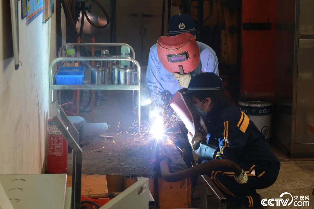 央视网消息:穿着长袖牛仔布防护服、防烫鞋,戴着工作帽、胶皮手套、防毒口罩,左手举着电焊罩,右手举着焊枪……作为中国铁路成都局集团有限公司重庆机务段唯一的女电焊工,45岁的殷燕飞焊修着受损的火车机车的部件。