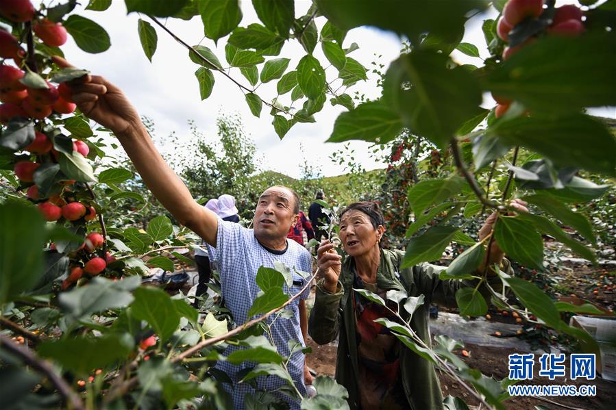 9月2日,孙显富(左)和村民在三星村的一处果园里交流种植技术。 新华社记者 刘磊 摄