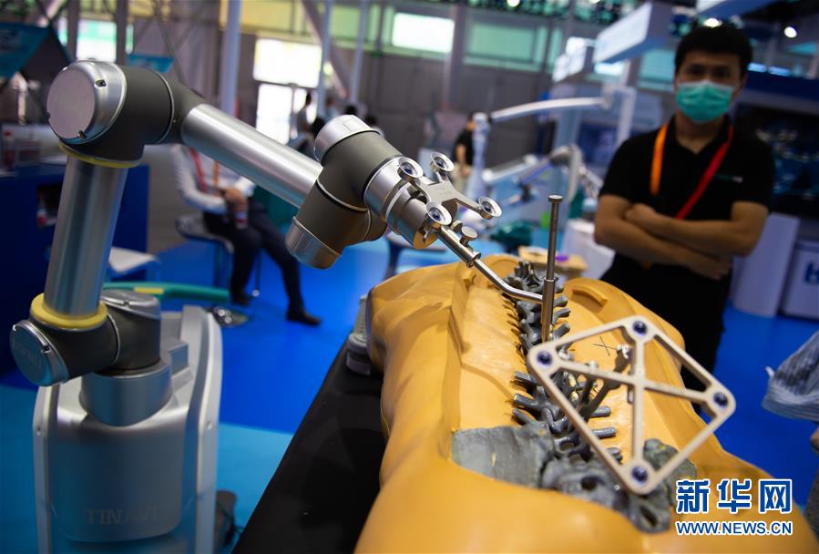 这是9月5日拍摄的服贸会服务机器人专题展区中的骨科手术机器人。 2020年中国国际服务贸易交易会于9月4日至9日在北京举行。 新华社记者 陈钟昊 摄