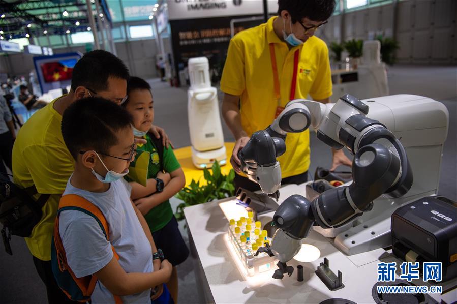 9月5日,观众在服务机器人专题展区观看微生物化验机器人演示。 2020年中国国际服务贸易交易会于9月4日至9日在北京举行。 新华社记者 陈钟昊 摄