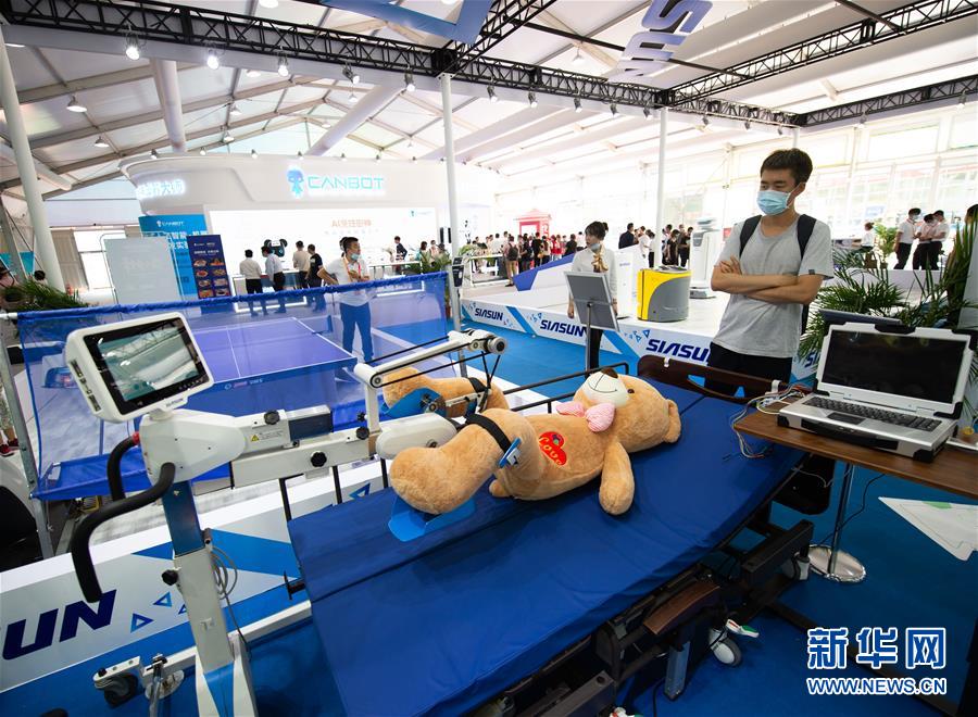 9月5日,观众在服贸会服务机器人专题展区观看上下肢主被动康复训练系统演示。 2020年中国国际服务贸易交易会于9月4日至9日在北京举行。 新华社记者 陈钟昊 摄