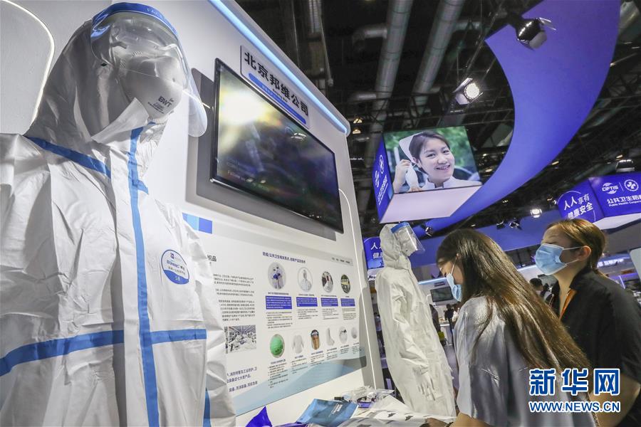 9月5日,观众在服贸会公共卫生防疫专区参观。 2020年中国国际服务贸易交易会于9月4日至9日在北京举行,位于综合展区的公共卫生防疫专区备受关注。 新华社记者 张玉薇 摄