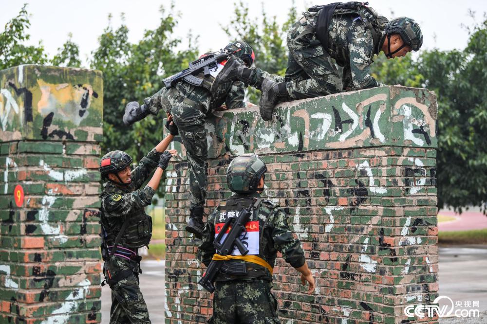 图为参赛队员正在协同翻越障碍物。(王肸 李哲)