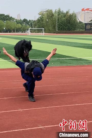 图为训导员与搜救犬玩耍互动 武一力 摄