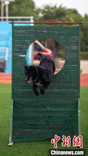 图为搜救犬正在进行跳跃障碍训练 艾诗洋 摄