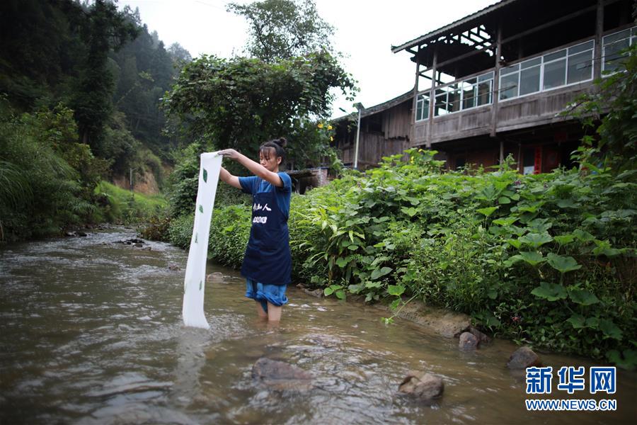 一名当地妇女在清洗布匹(9月6日摄)。 秋日时节,贵州省榕江县栽麻镇丰登侗寨的少数民族妇女利用有利天气条件,采集原料、织布、染布、晒布,精心制作具有民族特色的侗布。 新华社记者 刘续 摄