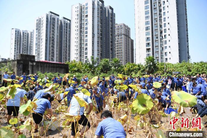 图为工人们正在藕田里捉鱼比赛。 陈超 摄