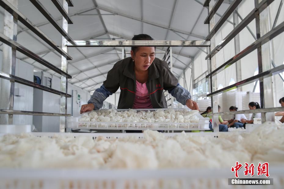 9月8日,农户在贵州晴隆普晴林场林下食用菌产业项目大棚内工作。近年来,贵州省黔西南布依族苗族自治州晴隆县加快推进林下食用菌产业发展。该县将项目点优先建在国有林场,降低林下食用菌产业成本。2020年晴隆县规划种植林下食用菌种植4000亩,2021年新增完成林下食用菌种植6000亩,累计完成林下食用菌种植10000亩。目前,已完成林下食用菌3094亩,带动务工2万人次,累计增收200余万元人民币。中新社记者 瞿宏伦 摄