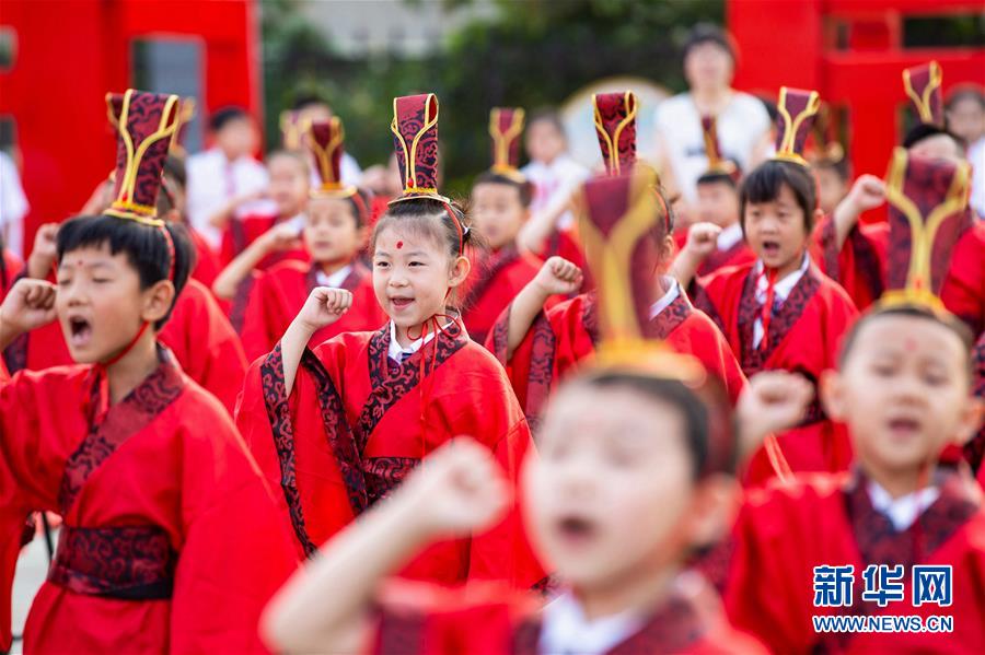 9月9日,武安市中山小学新生在“入泮礼”上宣誓。