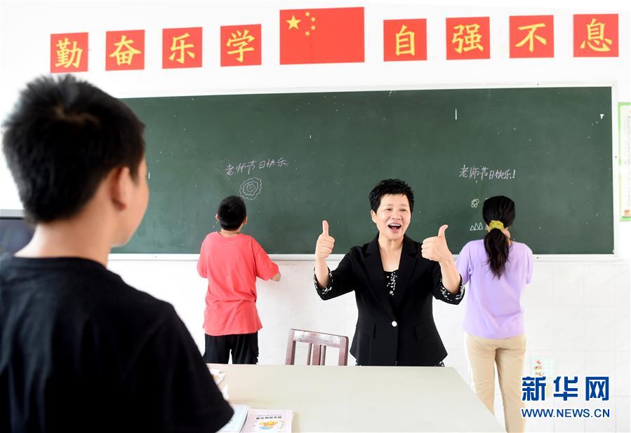 9月10日,蒋春凌在诸暨市特殊教育学校教室内上课时鼓励学生。 55岁的蒋春凌是浙江省诸暨市特殊教育学校教师,从事特殊教育已经34年。今年8月,蒋春凌被授予全国“最美教师”荣誉称号,被誉为西施故里“最美特教教师”。 蒋春凌说:“特殊教育是为那些可爱的生命打开心灵的一扇窗,撑起人生的一片天。回首34年特教经历,我感到无比充实和欣慰,此生无悔!” 新华社记者 韩传号 摄