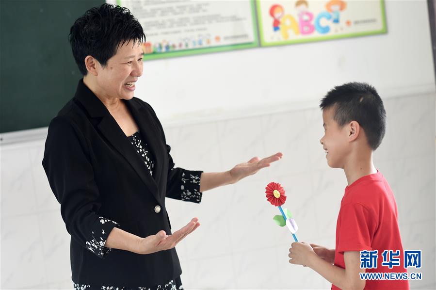 9月10日,一名学生向蒋春凌送上自己手工制作的花,祝她教师节快乐。 55岁的蒋春凌是浙江省诸暨市特殊教育学校教师,从事特殊教育已经34年。今年8月,蒋春凌被授予全国“最美教师”荣誉称号,被誉为西施故里“最美特教教师”。 蒋春凌说:“特殊教育是为那些可爱的生命打开心灵的一扇窗,撑起人生的一片天。回首34年特教经历,我感到无比充实和欣慰,此生无悔!” 新华社记者 韩传号 摄