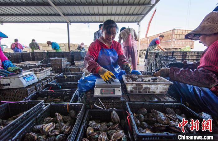 养殖工人们在分拣鲍鱼。 李信君 摄