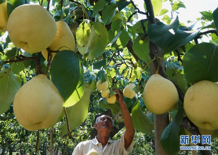 9月10日,晋州市马于镇的一名果农在梨园内采摘鸭梨。 近日,河北省晋州市的鸭梨、皇冠梨等优质梨果相继成熟。据介绍,晋州市目前梨树面积17万亩,年产优质梨60万吨,年产值达18亿元。 新华社记者 杨世尧 摄
