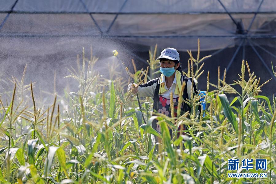 9月12日,工人在淮北市渠沟镇一生态观光田园综合体管护玉米。 近年来,安徽省淮北市相山区渠沟镇在推动农业产业结构升级过程中,依托当地资源条件和产业基础,引入农业企业,打造集农业、休闲、旅游、体验等为一体的田园综合体,带动农民就业增收致富,助力乡村振兴。 新华社发(万善朝 摄)