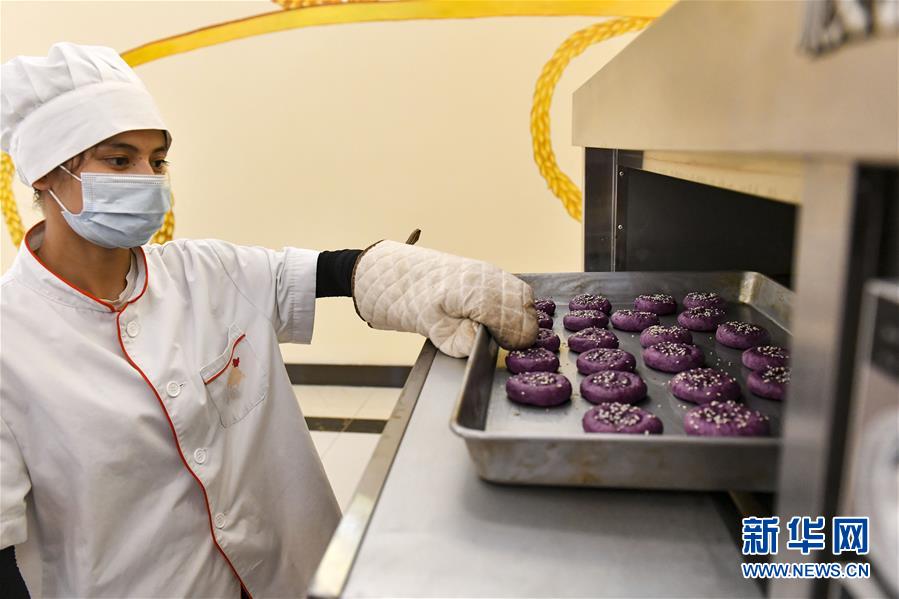 9月12日,伽师县馕文化产业园的一名工人用烤箱烤制紫薯馕。 新华社记者 马锴 摄
