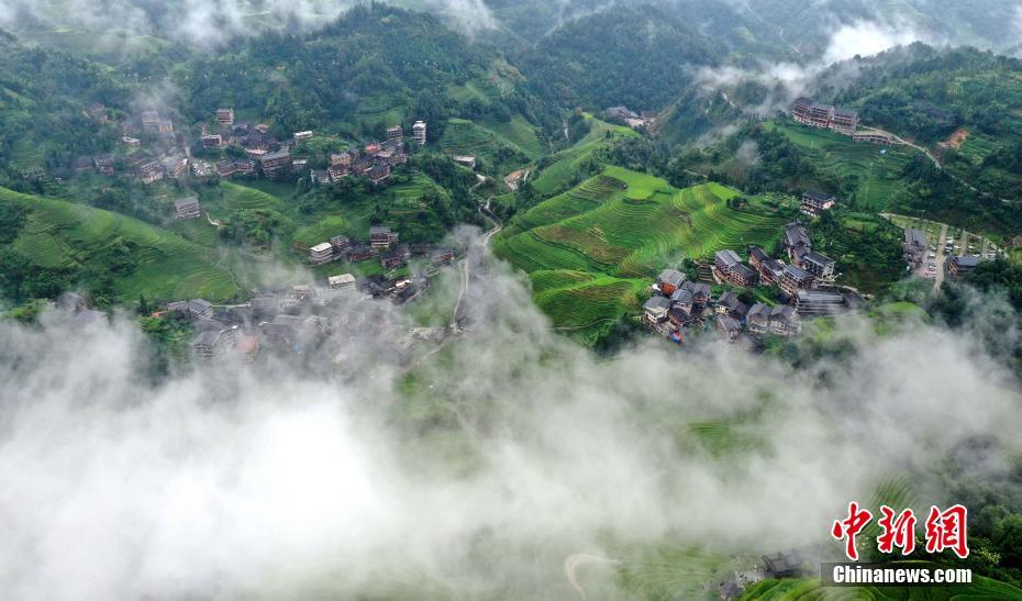 9月13日,广西桂林市龙胜各族自治县龙脊镇龙脊梯田云雾景观。秋日时节,广西桂林市龙胜各族自治县龙脊镇龙脊梯田雨后云雾缭绕,层层叠叠的梯田、错落有致的瑶族村寨在云山雾海中若隐若现,浓淡虚实相得益彰,美不胜收,吸引众多游客前来观光游览。 潘志祥 摄