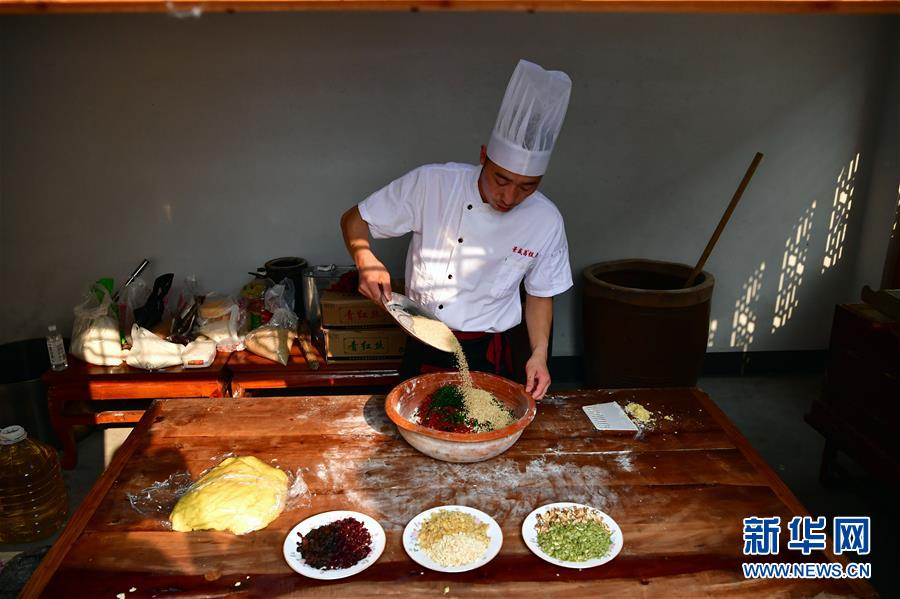 9月13日,在河南省商丘市夏邑县太平镇聂陈楼村,张旭在拌月饼馅。 张旭是河南省商丘市夏邑县太平镇聂陈楼村人,31岁的他已是河南老字号月饼品牌景盛昌的掌门人。 景盛昌创始于清咸丰十年(1860年),其吊炉月饼皮层酥松、馅料充实,独具特色。2007年,张旭高中毕业后便跟随父亲学习月饼制作技艺。除用现代化手法制作月饼外,他坚持传承古法月饼制作技艺,使用传统工艺自制的麦芽糖浆和面,经过选料、拌馅、制皮、包馅、成型等十多道工序,以传统的吊炉果木烘焙工艺精心制作而成。 “古法月饼制作技艺是一笔宝贵的文化财富,我愿意把它好好传承下去,留住乡土美食记忆。”张旭说。 新华社记者 冯大鹏 摄