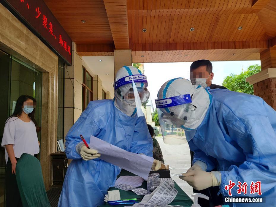 9月15日,医护人员对瑞丽市玉瑞温泉花园酒店的入住人员进行信息核对。当日起,瑞丽市对城区市民陆续开展核酸检测。云南省瑞丽市14日通报了2例缅甸输入新冠肺炎确诊病例的轨迹详情,并宣布将对瑞丽城区全员开展核酸检测,费用由政府承担。 中新社记者 韩帅南 摄
