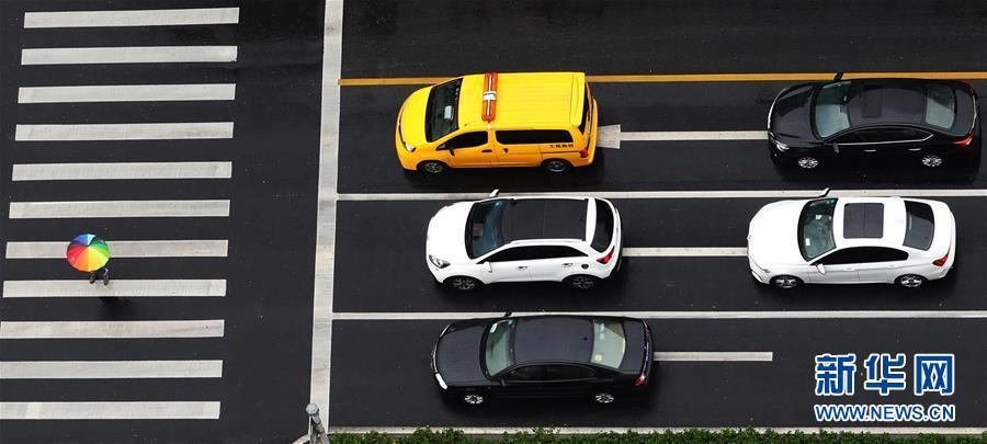 9月15日,在江苏省苏州市干将路,行人在雨中走过斑马线。 当日,江苏省苏州市出现降雨天气。 新华社发(杭兴微 摄)