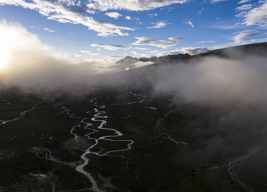 这是9月15日拍摄的邦达草原清晨(无人机照片)。 邦达草原位于西藏昌都市八宿县境内。高山深谷中的邦达草原是一块地势宽缓、水草丰美的高寒草原,也是野生动物的乐园。 新华社记者 普布扎西 摄