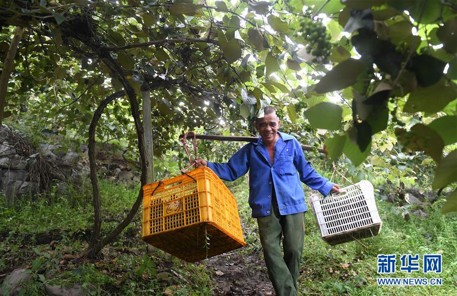 9月16日,在广西罗城仫佬族自治县东门镇大境村,一名村民挑着刚刚采摘的毛葡萄走出葡萄园。 时下,广西罗城仫佬族自治县迎来毛葡萄成熟季节,当地农民抢抓农时,采收、销售毛葡萄。 近年来,罗城仫佬族自治县利用毛葡萄生长特性,把发展毛葡萄种植与治理石漠化、脱贫攻坚结合,按“公司+基地+千家万户”的模式大力发展毛葡萄产业。目前,全县有毛葡萄种植面积8万亩,先后建立了县级示范基地2个、乡镇级示范基地11个、重点村屯示范园5000多亩,毛葡萄已成为当地群众脱贫致富的重要产业。 新华社记者陆波岸摄
