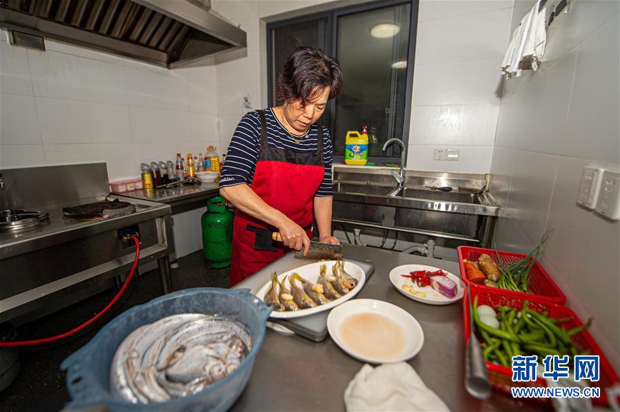 9月16日,沙塘湾村的村民朱招娣在民宿厨房里为游客准备晚餐。 浙江省宁波市象山县石浦镇沙塘湾村是个拥有近四百年历史的渔村。近年来,当地政府加强对沙塘湾村的基础设施建设,现在沙塘湾村的村民逐渐从山坡上老旧的房屋中搬离,住进临海的新居,并利用当地的自然资源,积极发展旅游产业。昔日的老渔村变成了海岸线上的一道新风景。 新华社发(江汉 摄)
