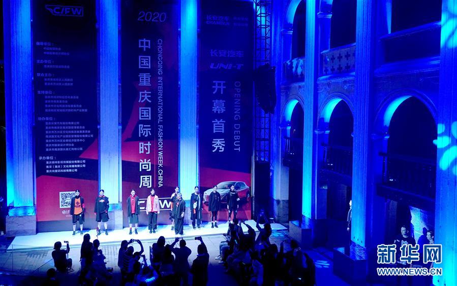 9月17日,模特在重庆市南滨路法国水师兵营旧址展示时装。 当日,2020中国重庆国际时尚周开幕式在重庆举行,中国时装设计金顶奖获得者刘勇,潮流插画家、跨界艺术家李欢及多名设计师共同上演开幕秀。 新华社记者 陈建力 摄