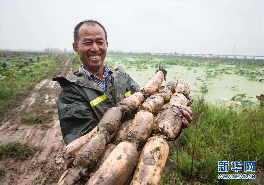 9月16日,藕农在湖北省洪湖市雨钱莲藕种植专业合作社的藕田旁展示收获的莲藕。 眼下正是湖北莲藕收获的季节,藕农们抢抓农时采收。 新华社记者肖艺九摄