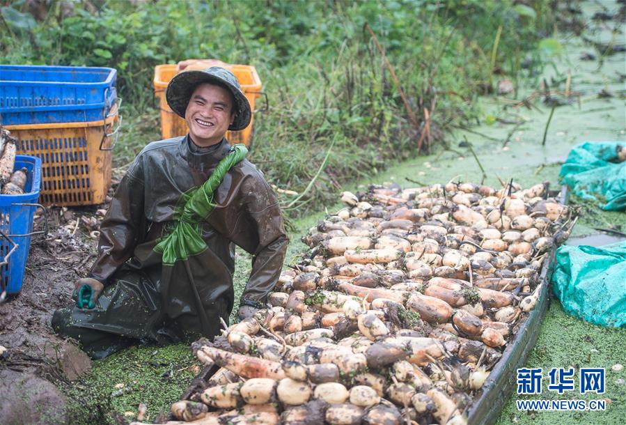 9月16日,藕农在湖北省洪湖市雨钱莲藕种植专业合作社的藕田间忙碌。 眼下正是湖北莲藕收获的季节,藕农们抢抓农时采收。 新华社记者肖艺九摄