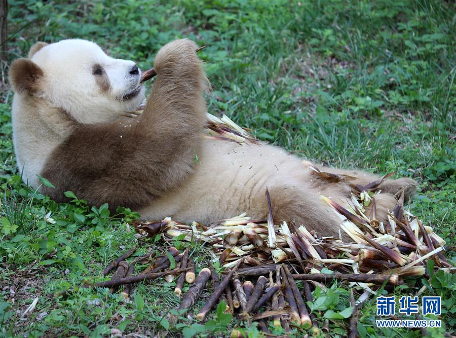 9月17日,“七仔”在位于陕西西安的秦岭大熊猫研究中心吃竹笋。 生活在陕西西安秦岭大熊猫研究中心的“七仔”是世界唯一圈养棕色大熊猫。今年11岁的“七仔”因独特的毛色与憨态可掬的吃相走红网络,深受大家喜爱。在工作人员的悉心照料下,目前“七仔”身体状况良好。 新华社记者 梁娟 摄