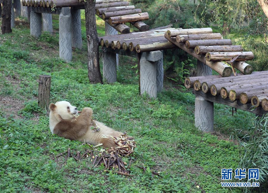 9月17日,“七仔”在位于陕西西安的秦岭大熊猫研究中心吃竹笋。 生活在陕西西安秦岭大熊猫研究中心的“七仔”是世界唯一圈养棕色大熊猫。今年11岁的“七仔”因独特的毛色与憨态可掬的吃相走红网络,深受大家喜爱。在工作人员的悉心照料下,目前“七仔”身体状况良好。 新华社记者 梁娟 摄