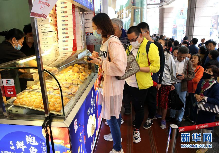 9月20日,顾客在上海南京路上排队购买现场制作的散装鲜肉月饼。 中秋临近,上海一些商家和老字号食品企业推出的散装月饼以丰富的品种和实惠的价格吸引顾客选购。 新华社记者 陈飞 摄