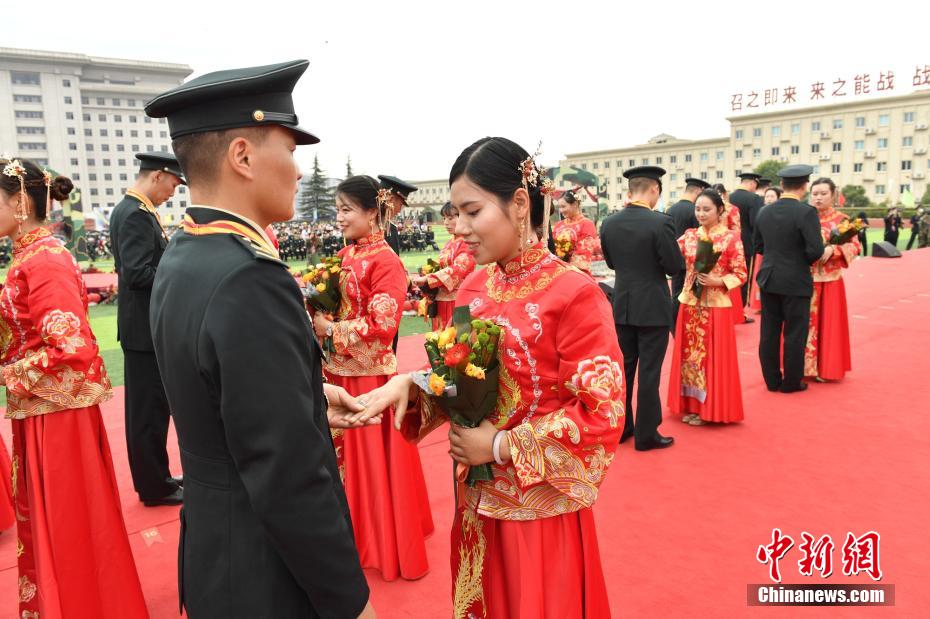 婚礼现场,新郎为新娘佩戴有火箭军专属标志的戒指。陈世锋 摄