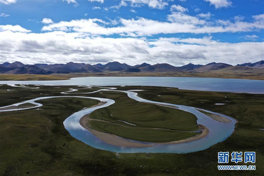 这是9月19日拍摄的西藏昌都市丁青县布托湖景色(无人机照片)。 布托湖位于西藏昌都市丁青县境内,由两个不同面积的高山湖泊组成。湖泊与蓝天、白云相互映衬,牦牛如黑珍珠般散落其间,景色迷人。 新华社记者 詹彦 摄